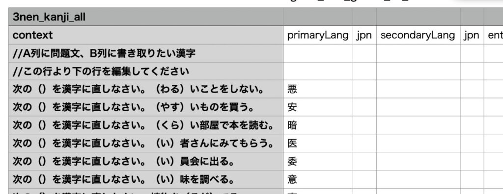 詳しくは、モノグサのヘルプページにやり方が載っています。ここからCSVファイルの雛形をダウンロードし、Google AIのGeminiにお願いして小3で習う漢字200文字のCSVファイルを自動で作成してもらいました。総作業時間は3分くらいです。すごい時代です。