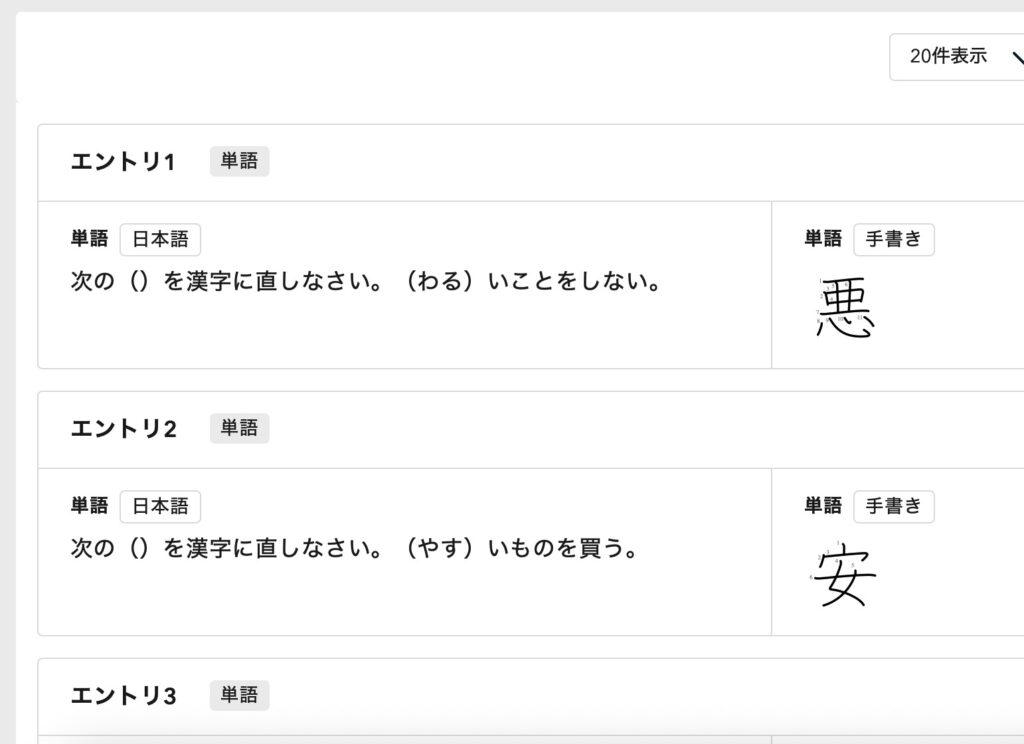 これをPrivateに公開してiPadで読み込ませれば、モノグサのアプリで漢字の手書き練習ができるようになります。間違えた問題は手厚くヒントを出し、正解した問題はヒントが少なくなっていきます。